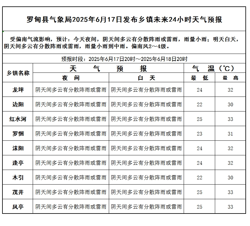 罗甸县气象局2025年6月17日发布乡镇未来24小时天气预报